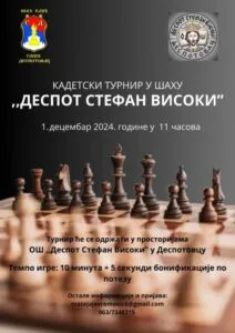NAJAVA TURNIRA U Despotovcu se 1. decembra održava kadetstki tunir u šahu „Despot Stefan Visoki. Turnir će se održati u prostorijama osnovne škole „Despot Stefan